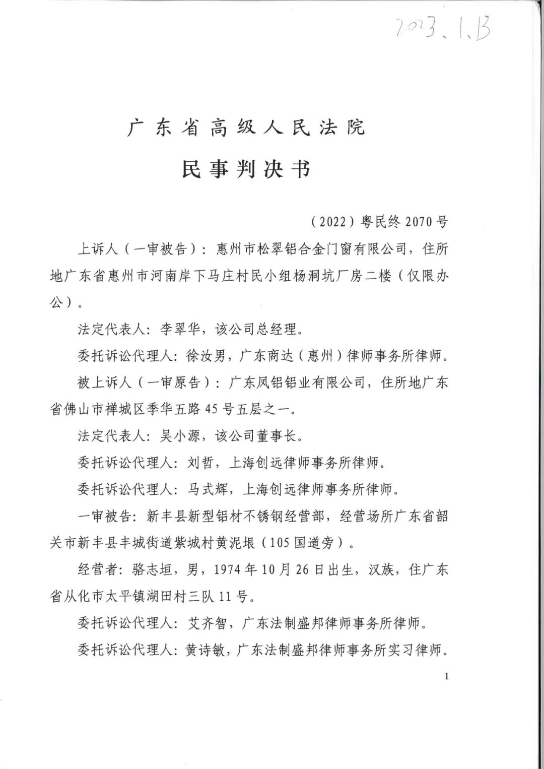 商丘辉知胜诉佳讯 | 侵害“凤铝”商标案广东高院二审维持原判,判决赔偿255万元